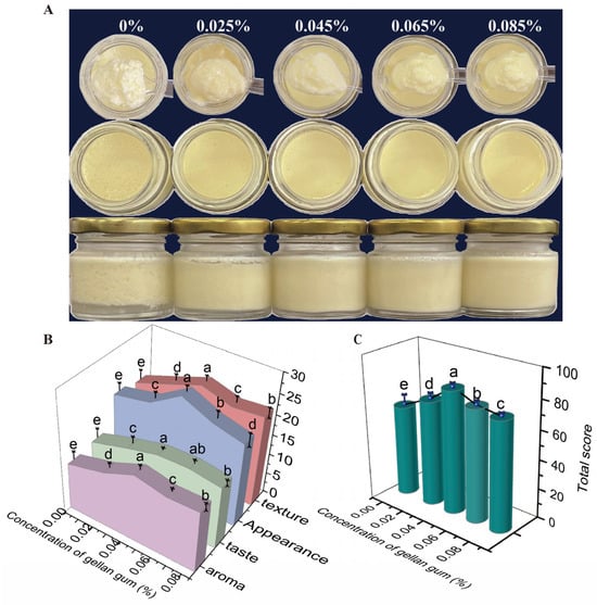Effect of gellan gum on the sensory quality of egg-based yoghurt. (A): Appearance and morphology of egg-based yoghurt with different additive amounts of gellan gum. (B): Individual sensory evaluation results of egg-based yoghurt with different additive amounts of gellan gum. (C): Total sensory evaluation scores of egg-based yoghurts with different additive amounts of gellan gum. Different letters indicate means with significant difference at p < 0.05.
