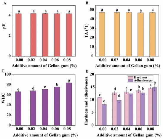 Effect of gellan gum additive amounts on pH (A), acidity (B), water holding capacity (C), and texture (D) of egg-based yoghurt. Different letters (a–e) indicate statistically significant differences (p < 0.05, Duncan’s new multiple range test) between samples.