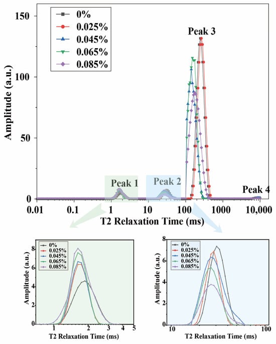 LF-NMR was used to characterize the changes in the moisture phase distribution of EBY at different gellan gum additive amounts. The T2 relaxation time reflects the distribution of water phases in yoghurt gels, providing a foundation for their quality and texture analysis [26]. The LF-NMR results (Figure 3) indicated the presence of four water phases in EBY: strongly bound water with a relaxation time of T21 (0.5–4.0 ms), weakly bound water with a relaxation time of T22 (10–60 ms), immobile water with T23 (100–700 ms), and free water with T24 (4000–10,000 ms). As the additive amount of gellan gum increased, the relaxation peak representing strongly bound water tended to shift to the left, with peak height and peak area gradually increasing. Conversely, the relaxation peak representing bound water also shifted to the left, but its peak height and peak area gradually decreased. These results indicate that the water phase state in EBY with gellan gum was significantly enhanced, with an increased proportion of strongly bound water and a decreased proportion of immobile water compared to the control group. This finding clearly explains why the WHC of the product significantly increased with the additive amounts of gellan gum and provides a basis for the improvement in the quality of yoghurt by gellan gum.