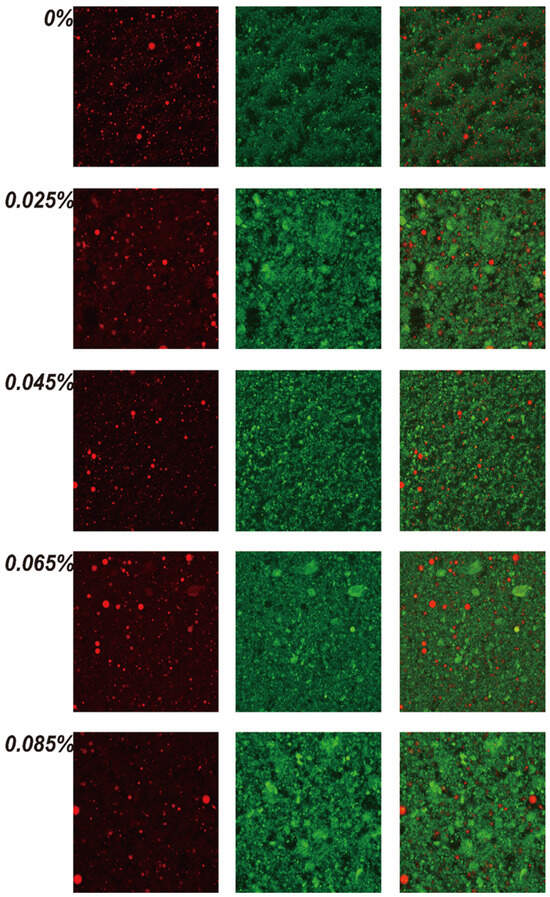 The microstructure of EBY at different gellan gum additive amounts was characterized using CLSM. In the images, green represents the proteins in the gel stained by Nile blue, while red represents the lipid components stained by Nile red. According to the CLSM results (Figure 4), adding gellan gum does not alter the distribution of lipid components but significantly improves the gel’s microstructure. The EBY without gellan gum did not exhibit noticeable graininess, but numerous holes and grooves were visible in the gel. As the gellan gum additive amounts increased from 0 to 0.045%, the gel network structure became smoother, and the holes and grooves gradually decreased in size and number. However, when the gellan gum additive amounts continued to increase beyond 0.045%, the gel network structure became rough and uneven again, with more prominent holes and grooves. In conclusion, gellan gum significantly improves the microstructure of EBY gels, with 0.045% being the optimal additive amount, corroborating the results of the sensory evaluations.