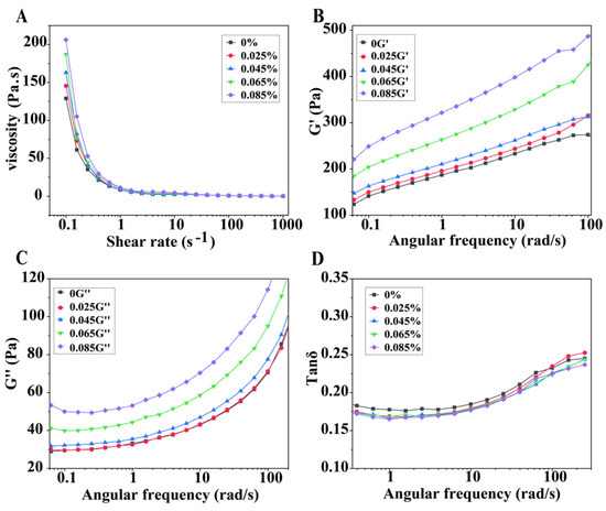 Rheological characterization of egg-based yoghurt with different gellan gum additive amounts. (A): Viscosity at different shear rates; (B): storage modulus at different angular frequencies (G′); (C): loss modulus at different angular frequencies (G″); (D): Tanδ at different angular frequencies. The values presented are representative graphs.