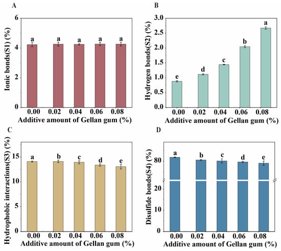 Variation in the ratio of intermolecular forces in egg-based yoghurt with different amounts of gellan gum addition. (A): Ionic bonding ratios of egg-based yoghurts at different gellan gum additions; (B): hydrogen bonding ratios of egg-based yoghurts at different gellan gum additions; (C): hydrophobic interactions ratios of egg-based yoghurts at different gellan gum additions; (D): disulfide bonding ratios of egg-based yoghurts at different gellan gum additions. Different letters (a–e) indicate statistically significant differences (p < 0.05, Duncan’s new multiple range test) between samples.