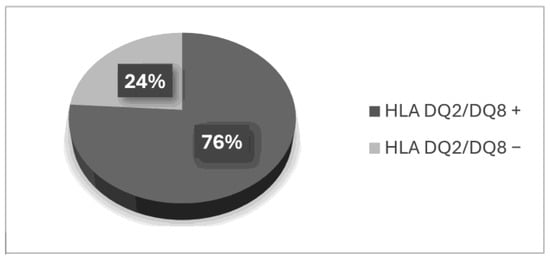 In the group of patients following a gluten-free diet who had been previously diagnosed with celiac disease, 12 (24%) did not meet the genetic criterion. Based on the performed analysis, the presence of two alleles of the HLA-DQ2 or -DQ8 antigens was not detected (Figure 1).