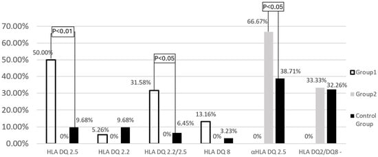 Among the remaining patients (Group 1) with celiac disease, the presence of HLA-DQ2.5 (50.0% vs. 9.68%; p < 0.01) and the co-occurrence of both alleles of HLA-DQ2 (31.6% vs. 6.45%; p < 0.05) were detected significantly more frequently than in the control group. Analyzing the frequency of HLA-DQ2.5 and HLA-DQ2.2 separately, the first variant was found to be significantly more frequent (81.58% vs. 36.84%; p < 0.01). Among patients with celiac disease, the prevalence of HLA-DQ8 was also slightly more frequent (13.2% vs. 3.23%; p > 0.05). Patients who did not meet the genetic criteria for celiac disease (Group 2) had a single string α- HLA-DQ2.5 significantly more often than control subjects (66.67% vs. 38.71%; p < 0.05) (Figure 2).