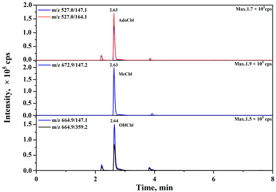 Chicago/Turabian StyleFan, Zhihao, Yajie Li, Xia Fan, Pei Wang, Runqiang Yang, and Chong Xie. 2025. "Simultaneous Determination of Three Active Forms of Vitamin B12 In Situ Produced During Fermentation by LC-MS/MS" Foods 14, no. 2: 309. https://doi.org/10.3390/foods14020309