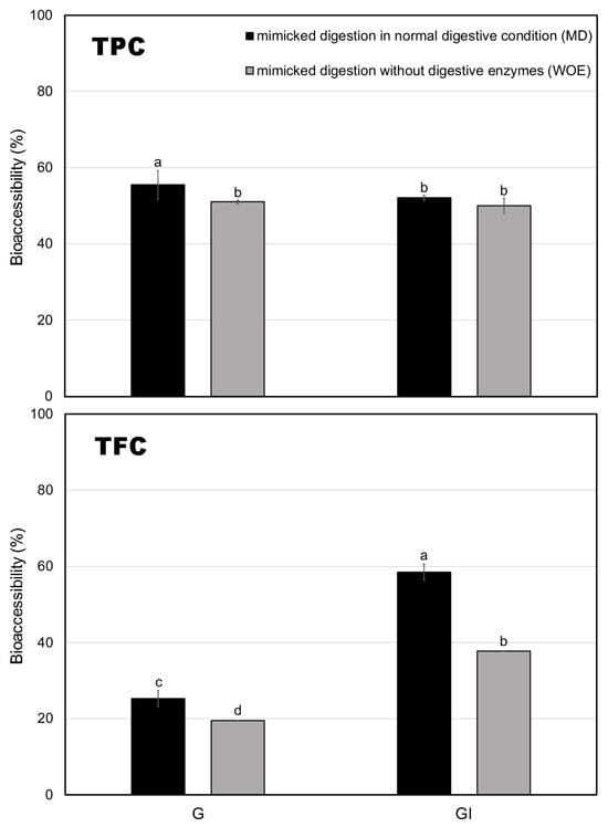 For TFC, the effect of digestive enzymes was even more pronounced. During the G phase, TFC bioaccessibility in the MD group was 25%, compared to only 20% in the WOE group. However, as digestion progressed to the GI phase, the MD group saw a surge in TFC bioaccessibility to nearly 60%, whereas the WOE group increased to only 38%. This significant difference underscores the crucial role of digestive enzymes in flavonoid release, particularly during the intestinal phase. The breakdown of flavonoid glycosides and the release of aglycones through enzymatic hydrolysis may explain the enhanced bioaccessibility observed [27,28]. Nevertheless, it is also important to consider potential limiting factors. Binding with bile salts and interactions with digestive enzymes might lead to the formation of insoluble complexes, partially hindering the release and solubility of flavonoids under intestinal conditions [29,30]. This interplay between enzymatic release and potential bile salt interactions likely determines the overall bioaccessibility of flavonoids. These interactions probably influence the overall bioaccessibility of flavonoids and warrant further investigation.