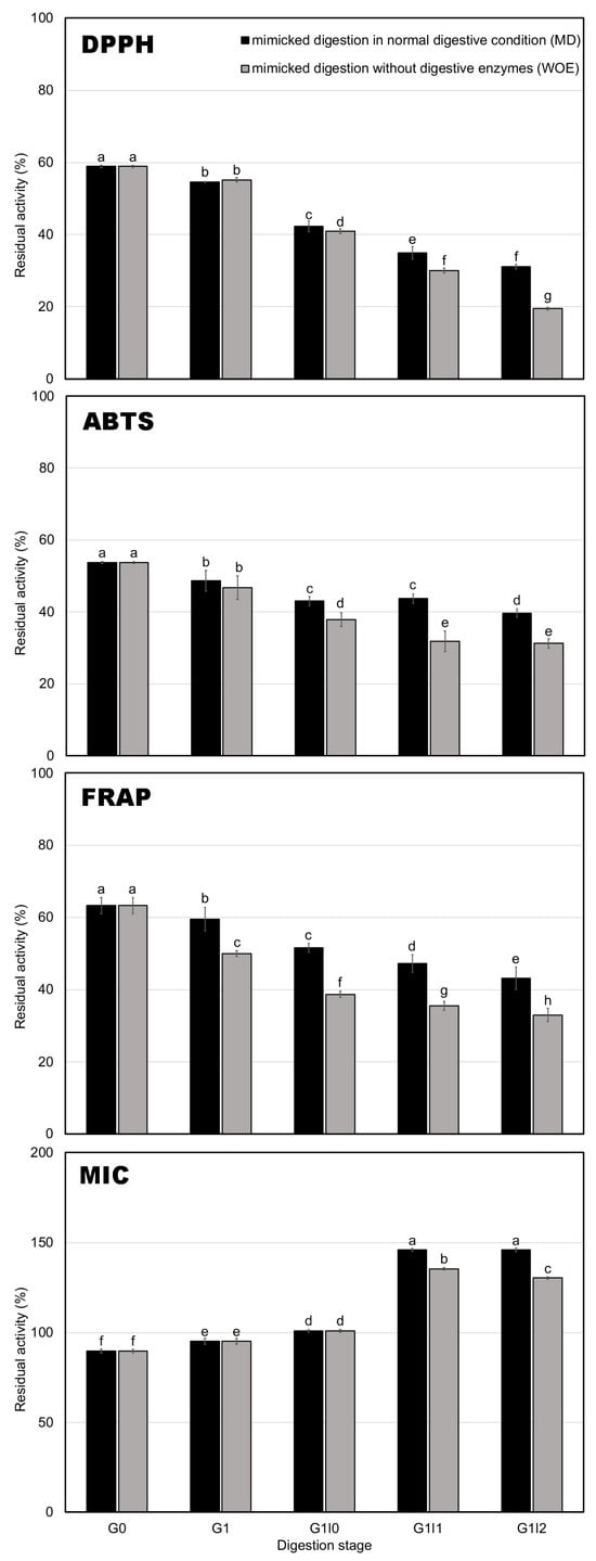 Residual activity of roasted green tea infusion during simulated digestion, evaluated by DPPH, ABTS, FRAP, and MIC assays. Bars represent the standard deviation of triplicate determinations. Lowercase letters indicate significant differences among samples within the digestion stages (G0, G1, G1I0, G1I1, and G1I2) (p < 0.05). Uppercase letters denote significant differences between mimicked digestion in MD and WOE within the same digestion stage (p < 0.05).
