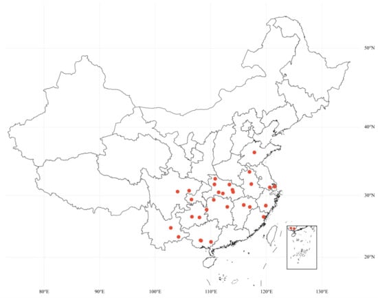 Sampling locations for R. arrhizus strains isolated from multiple regions across China. The map was generated using the online platform https://www.bioinformatics.com.cn (Version 1.0, accessed on 3 June 2024).