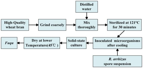 The Fuqu production process (Figure 2) followed the method of Yu et al. [55]. High-quality bran was mixed with water (1:1 w/v) and steamed at 115 °C for 30 min. After cooling to 30 °C, the bran was inoculated with an R. arrhizus spore suspension, transferred to 15 cm culture dishes (100 g per dish), and incubated at 30 °C with 90–95% relative humidity for 3 days, with periodic mixing. The resulting Fuqu samples were then dried at 45 °C for 12 h. The enzyme solution was prepared following the method of Yu et al. [55]. Various enzyme activities were then determined using the following established methods: Glucoamylase activity was determined following the method described by Miller et al. [56]. Amylase activity was assessed following the method described by Gupta et al. [57]. Acidic protease activity was measured according to the method of Zhang et al. [58]. Esterase activity was determined following an adapted procedure from Gilham and Lehner [59], involving adding 4 mL of PVA-olive oil emulsion and 5 mL of 0.025 mol/L KH2PO4-Na2HPO4 buffer (pH 7.5) to an Erlenmeyer flask. After adding 1 mL of enzyme solution, the mixture was incubated for 15 min. Following incubation, 15 mL of 95% ethanol and two drops of phenolphthalein were added, and the solution was titrated with 0.05 mol/L NaOH.