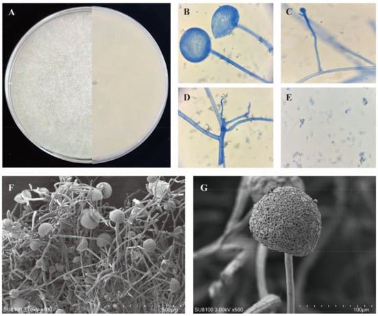 Macroscopic and microscopic morphology of typical R. arrhizus (W17) on MEA after 3 days of incubation at 30 °C (A); sporangium (B); Sporangiophore; Columella, Collarette, Apophysis and Stolon (C); Hypha and rhizoids (D); spores (E); R. arrhizus showing a panoramic view of the hyphal and spore structure, magnified at 100×. The dense network of mycelium intertwined with sporangia is evident (F); close-up SEM of a R. arrhizus sporangium, magnified at 500×, and this detailed view captures the textured surface of the sporangium (G).