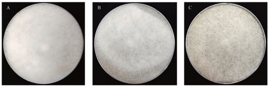 Three distinct levels of sporulation among R. arrhizus strains were identified and categorised as Grades A (low sporulation), B (medium sporulation), and C (high sporulation) (Figure 4). Significant variability in spore production was observed among the 78 strains analysed. All R. arrhizus strains used in this study were obtained from Jiuqu and are considered autochthonous. These strains exhibited diverse sporulation capacities, indicating significant intraspecific diversity. This variability reflects the inherent genetic and phenotypic diversity of R. arrhizus strains traditionally used in fermentation processes. Similar findings have been reported in studies on Rhizopus microsporus, where the source of isolation was not significantly associated with molecular differences or reduced sporulation abilities. Moreover, the assumption that specific morphologies, such as those of Rhizopus oligosporus, represent separate species confined exclusively to fermented food sources has been contested [52]. These observations underscore the complexity of Rhizopus species diversity and the significant role of prolonged domestication in influencing strain characteristics.