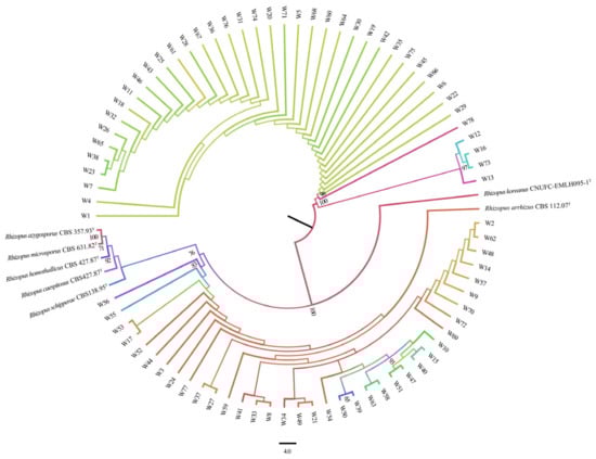 Subcultures from 78 strains were grown on 5% MEA at 30 °C for three days, with strain W17 selected as a representative for detailed morphological analysis. Light microscopy observations were performed using a Nikon Eclipse 80i microscope and lactic acid phenol cotton blue (Qingdao Hi-Tech Industrial Park Hope Bio-Technology Co., Ltd., Qingdao, Shandong, China) as the mounting medium, and images were captured with a Nikon DS-Ri1 digital camera. Morphological characteristics were further examined using a scanning electron microscope (SEM; Model SU8100, Hitachi High-Technologies Corporation, Tokyo, Japan).