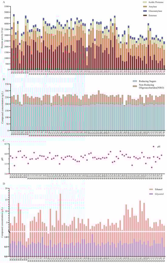 The activities of acid protease, amylase, glucoamylase, and esterase were measured in 78 autochthonous R. arrhizus (Figure 6A). Significant differences were observed in acid protease, amylase, and esterase activities among the strains, while glucoamylase activity remained relatively stable. Acid protease activity varied considerably, ranging from 280 U/g to 1023 U/g, with an average of 550 U/g, indicating substantial variation across strains. Yu et al. screened wheat koji for high enzyme activity and identified an R. arrhizus strain with elevated acid protease and amylase activities in Huangjiu production, consistent with the findings of this study [55]. These results support the conclusion that rational strain selection can significantly enhance fermentation performance.