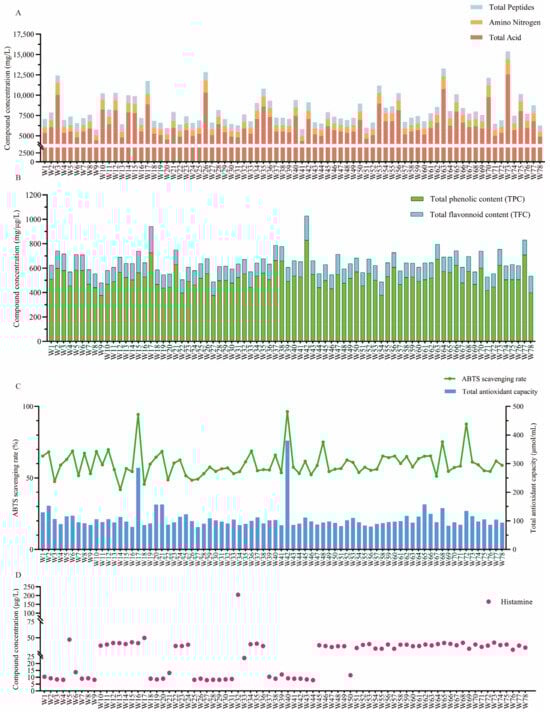 Comparison of total acid, amino nitrogen, and total peptide content in different R. arrhizus fermentations (A); comparison of total flavonoid content, total phenolic content in different R. arrhizus fermentations (B); comparison of ABTS scavenging rate, total antioxidant capacity in different R. arrhizus fermentations (C); comparison of histamine content in different R. arrhizus fermentations (D).