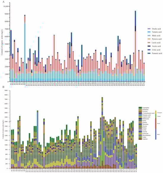 Composition of organic acids (A) and amino acids (B). (A) The stacked bar chart depicts the concentrations of eight organic acids—oxalic acid, tartaric acid, malic acid, pyruvic acid, lactic acid, acetic acid, citric acid, and fumaric acid—in the fermentation samples. Each bar represents the total organic acid content (mg/L) for a specific strain, with individual acids distinguished by colour coding. (B) The stacked bar chart illustrates the concentrations of 18 amino acids—tryptophan, glutamine, tyrosine, γ-aminobutyric acid, glutamic acid, aspartic acid, methionine, serine, alanine, threonine, glycine, proline, lysine, leucine, isoleucine, phenylalanine, valine, arginine, and histidine—in the fermentation samples. These amino acids are classified according to their taste profiles (umami, sweet, bitter, or astringent), as indicated by the coloured labels in the legend. The total amino acid content (mg/L) for each strain is represented by a bar, with individual amino acids distinguished by colour coding.