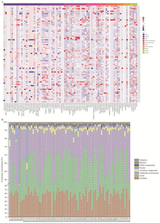 All statistical analyses were conducted using GraphPad Prism 9.5.0 (GraphPad Software Inc., San Diego, CA, USA), Origin 2024 (OriginLab Corp., Northampton, MA, USA), and IBM SPSS Statistics 25.0 (SPSS Inc., Chicago, IL, USA). A heatmap was generated to illustrate the volatile compound profiles of different rice wine samples using Chiplot Tools (Version 1.0, accessed on 9 September 2024, https://www.chiplot.online) after Z-score standardisation. Each sample was analysed in triplicate.