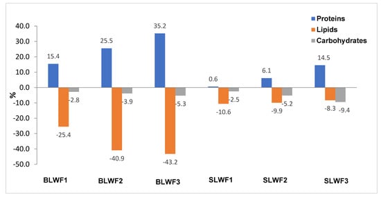 Figure 3 shows the increases/decreases of nutritional parameters in composite flours (BLWF and SLWF) compared to type 650 wheat flour intended for a bakery. There is an important increase in the protein content that varies between 15.4–35.2% depending on the percentage of wheat flour substituted with lentil flour (BLWF), between 0.6–14.5% in the case of fortification with 10–20% of sprouted lentil flour (SLWF). The lipid content, however, decreases with the substituted fraction, the decrease being significant and between 25.4–43.2% depending on the percentage of black lentil flour added, and between 8.3–10.6% when replacing wheat flour with lentil sprout flour.