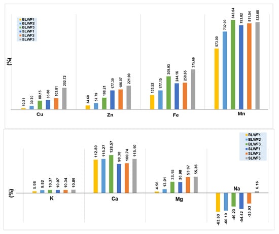 Manganese is the microelement that registered the most significant increase, varying between 573.00% in the case of substitution with 10% lentil flour (BLWF1) and 843.64% when 20% lentil flour was added to wheat flour. The recorded value for Mn in the case of type 650 wheat flour was 2.088 mg/kg and it reached a maximum value of 19.700 mg/kg in the BLWF3 variant. Ref. [