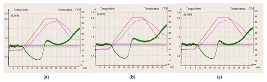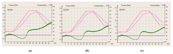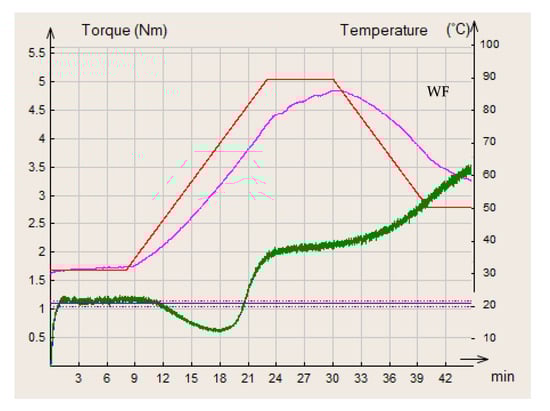 39]. This parameter also registers significant decreases due to the addition of a legume matrix, especially in the case of SLWF samples (C3: 1.302–1.426 Nm) compared with WF (C3:1.917 Nm).