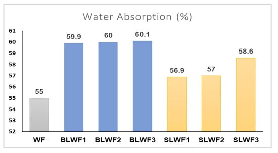 Analysis of the results showed that water absorption was lower for the control sample (WF) than for the other samples with different proportions of black lentil flour and black lentil sprouts. For samples containing black lentil flour, water absorption varied between 59.9% and 60.1%. There was also an increase in the water absorption value with increasing quantities of black lentils in the samples. The same observation was made for composite flours containing various levels of substitution of wheat flour by black lentil sprouts. The water absorption values were 56.9%, 57%, and 58.6%, respectively, for SLWF1, SLWF2, and SLWF3. Similar results were obtained by Dabija et al., 2017 [
