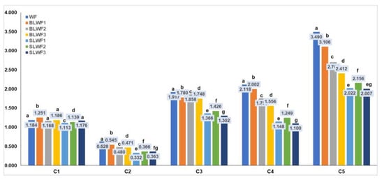 C1 is a characteristic for the first part of the MIXOLAB profile that defines the mixing parameters at 30 °C; for this parameter, there were no significant differences among the values obtained for WF, BLWF2, BLWF3, and SLWF3.