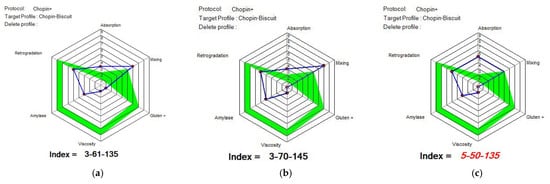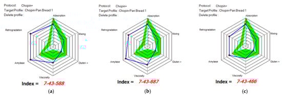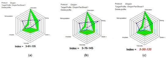 Figure 14 show the indices of WF’s MIXOLAB profile for samples of flours blended with black lentil and black lentil sprouts, compared with the indices recommended by MIXOLAB for bread production. Analysis of these figures showed that the absorption index recommended by MIXOLAB for bread production was between eight and nine. Of all the flours analyzed, only those with different proportions of black lentils (BLWF) had an absorption index close to that recommended by MIXOLAB. There was no change from one sample to the next. They all obtained an index equivalent to seven. On the other hand, the composite flours with different proportions of black lentil sprouts (SLWF) obtained an index equivalent to three. Given that the absorption index is the MIXOLAB parameter used to measure a flour’s water absorption capacity [