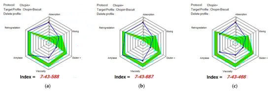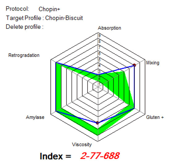 The MIXOLAB CHOPIN Technologies was used to determine the rheological characteristics of the different types of flour used in this study. The MIXOLAB CHOPIN is a dough characterization instrument designed to evaluate flour’s quality and baking performance. It provides a comprehensive view of the dough’s behavior during the baking process and measures several key parameters such as water absorption capacity, mixing stability, initial heat resistance, viscosity variation during heating, viscosity at high temperature, and viscosity during cooling. This instrument simulates real conditions of flour used in bakery products, analyzing dough consistency and protein and starch quality [