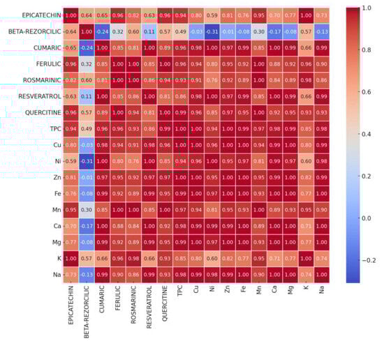 The microelements analyzed (Zn, Fe, Mn, and Cu) generally presented strongly positive correlations with the majority of individual polyphenols, except for beta-resorcilic acid, which presented negative or weakly positive correlations with all microelements.