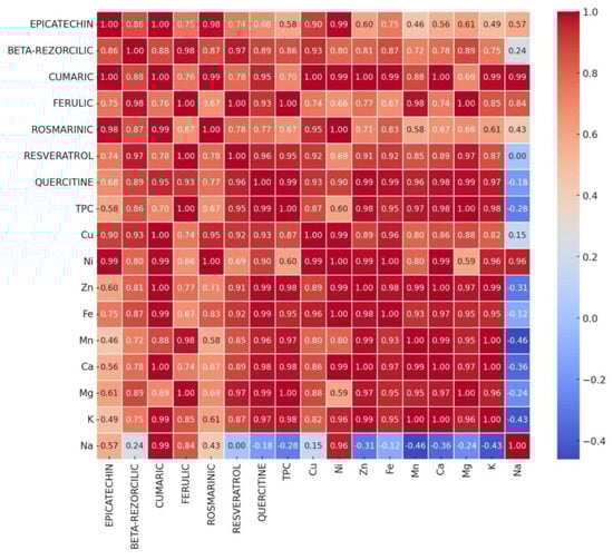 Among the microelements, Fe, Zn, Mn, Cu were strongly positively correlated (r > 0.85) with TPC, coumaric acid, quercetin and resveratrol, while Cu and Ni showed strongly positive correlations with epicatechin (r > 0.9).