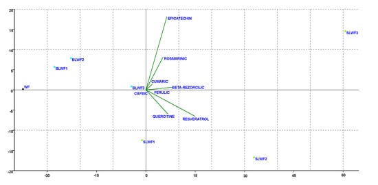 Figure 20 it can be observed that the WF sample is positioned far on the negative side of PC1, which indicates a low content of polyphenols. BLWF1, BLWF2, and BLWF3 are grouped near the origin, in the central area of the graph, indicating a balanced content of polyphenols such as coumaric, beta-resorcilic, and ferulic. SLWF1 and SLWF2 are positioned on the negative side of PC2 and they show differences from BLWF, but they remain closer in terms of chemical composition, while SLWF3 is distinct, indicating a high content of major polyphenols. Vectors that form a small angle to each other (e.g., resveratrol and quercetin) indicate a strong positive correlation between these variables, while variables with opposite or perpendicular vectors have a low or negative correlation.