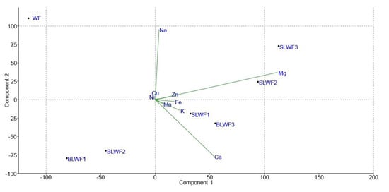 From the interpretation of the biplot, it can be seen that WF is located in the negative part of Component 1 and Component 2, suggesting a low content of the variables related to these vectors (K, Mg, and Fe). Samples BLWF1, BLWF2, and BLWF3 are grouped in the negative part of PC2, indicating chemical similarities, their content being more balanced in trace elements such as Zn and Fe. SLWF3 is clearly positioned in the positive part of PC1 and PC2, indicating a high content of Mg, K, and other elements. SLWF2 also lies on the positive side of PC1, suggesting a similar but less extreme profile than SLWF3. SLWF1 is positioned between BLWF and SLWF3, indicating an intermediate composition. The vectors of the Mg, K, and Ca variables are long, which suggests a significant influence on the variation explained by Component 1, while Na is positioned almost perpendicular to Component 2, which indicates a more modest influence on PC2. Zn and Fe contribute to the differentiation of the samples on Component 2, having vectors oriented in the direction of the BLWF samples.