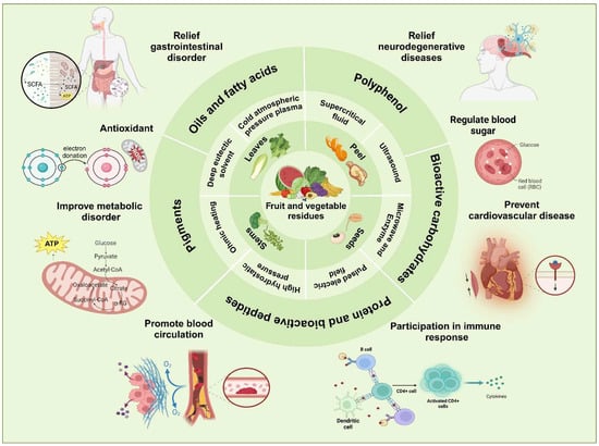 There have been many previous studies on the extraction and reprocessing of bioactive compounds in FVW, and the traditional extraction methods include: solid–liquid extraction, Soxhlet extraction, and liquid–liquid extraction [14]. However, these methods have obvious drawbacks, such as high solvent consumption, low extraction efficiency, limited extraction scale, risk of thermal degradation of thermally unstable components, and long extraction time [15]. This review categorizes the sources of functional factors and corresponding high value-added components in FVW, while focusing on emerging technologies from the source to the final product. In addition, possible avenues for the further development of extracts into products as novel food ingredients are explored, and this component to further enhance the value of the waste stream can be utilized. And finally, the main issues behind the development of laboratory methods into actual marketable products are discussed.