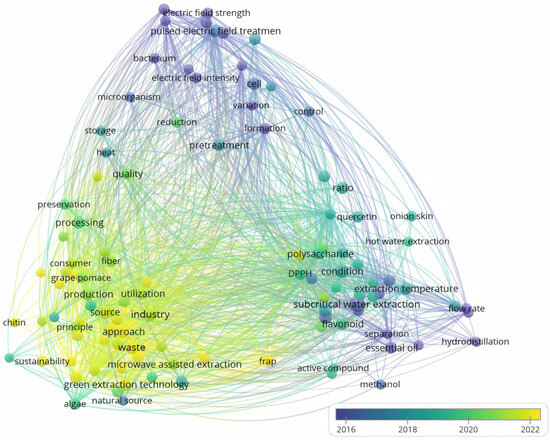 In recent years, emerging food ingredients have become a new trend in the food industry due to the surge in demand for health and environmental protection. More studies are focusing on the reuse of functional ingredients from FVW. However, for the wide variety of FVW, it is necessary to analyze the functional components contained in a specific and detailed manner. In addition, the optimization of the whole process, from raw material selection to extraction method application, should be the focus of attention. Many attempts have been made to produce bioactive compounds from FVW. Whereas novel extraction methods are able to extract active ingredients from fruit and vegetable wastes in a more economical, rapid, efficient and environmentally friendly manner. Till now, yield improvements have been shown in the use of ultrasound-, microwave-, supercritical fluid-, pulsed electric field-, or enzyme-assisted extraction. The survey of extraction techniques for phytochemicals in fruit and vegetable residues compiled by searching the relevant literature through VOSviewer at Web of Science is presented in Figure 2.