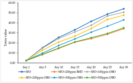 The effect of OBO and BHT on TOTOX of cold-pressed SFO during 30 days of storage period; OBO—Oenothera biennis oil, BHT—butylated hydroxytoluene, TOTOX value—total oxidation value, SFO—sunflower oil.