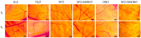 Effects of the tested samples in the HET-CAM assay. Stereomicroscope images show the aspect of CAMs before (t0) and after 300 s (t5); SLS—sodium lauryl sulfate, OBO—Oenothera biennis oil, BHT—butylated hydroxytoluene, SFO—sunflower oil. Scale bars represent 500 µm.