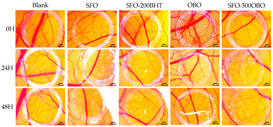 Effect on the CAM of SFO–500 OBO compared to OBO, SFO–200 BHT, SFO, and the blank. Stereomicroscopic images were taken before application, and 24 h and 48 h post-treatment; OBO—Oenothera biennis oil, BHT—butylated hydroxytoluene, SFO—sunflower oil. Scale bars represent 500 µm.