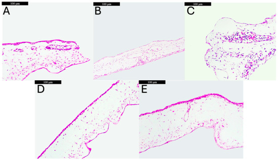 Histological aspects of the CAM treated, HE staining: (A) control group with no intervention—normal histological structure; (B) SFO CAM group—a slight thinning of the mesodermal layer; (C) SFO–BHT CAM group—edema in the mesodermal layer and an increasing influx of intravascular inflammatory cells; (D) OBO CAM group—a significant decrease in the number blood vessels in the mesodermal layer; (E) SFO–OBO CAM group—a discrete reduction in the number blood vessels in the mesodermal layer; Scale bars represent 100 µm, magnification ×20.