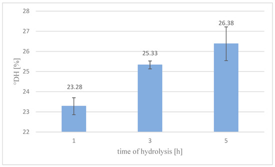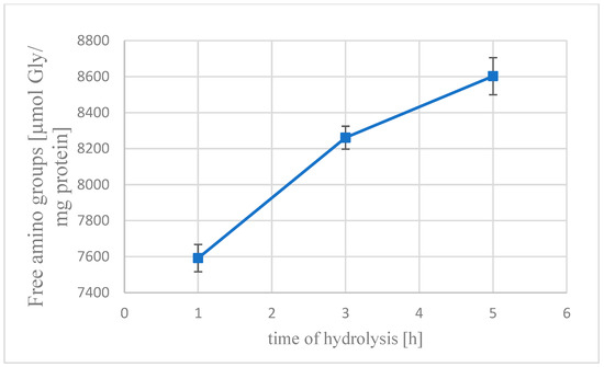 The results presented in Figure 1 were obtained from both methods and indicate that an increase in the degree of hydrolysis occurs with an increase in hydrolysis time. The highest values (26.38%) were obtained after 5 h of degradation. As expected, the degree of hydrolysis increased proportionally with hydrolysis time, consistent with well-established biochemical principles. Consequently, this finding substantiates the efficacy of Cucurbita ficifolia protease in hydrolyzing defatted yellow mealworm protein within the experimental parameters. The enzymatic hydrolysis process led to a progressive increase in the degree of hydrolysis [%] as shown in Figure 2. Notably, the highest free amino group (FAG) concentration was observed after a five-hour reaction, reaching 8602.84 [µmol Gly/g protein], with the total hydrolysis score culminating at 32,608.1 [µmol Gly/g protein]. This result highlights the efficiency of the hydrolysis process over time, demonstrating a direct correlation between the reaction duration and protein degradation, as evidenced by the measurable increase in FAG levels.