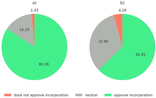 Spanish and Polish consumer acceptance of insect’s incorporation in food matrix [%]: (a) Polish consumer responses. (b) Spanish consumer responses.