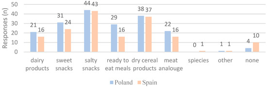 A comparative analysis of consumer preferences for products enhanced with insect powder among Polish and Spanish respondents (Figure 4) reveals significant differences and shared trends. Both groups show a clear preference for salty snacks and dry cereal products, with Polish consumers exhibiting a more pronounced inclination toward these categories. Additionally, Polish respondents demonstrate greater interest in sweet snacks and ready-to-eat meals, which may reflect differences in taste, food traditions, and food availability. In contrast, Spanish respondents indicate greater reluctance toward insect-enhanced products, highlighting cultural and demographic influences on acceptance.
