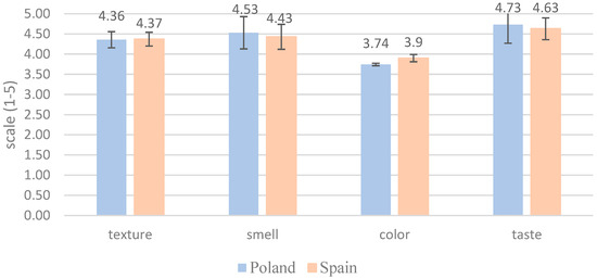 When evaluating the relevance of sensory aspects for insect-enhanced food products, both Polish and Spanish consumers prioritize texture, smell, and taste over color. This aligns with the findings of the study by Martins et al., which emphasize the importance of sensory experiences in consumer acceptance of novel foods, particularly insect-based products [42].