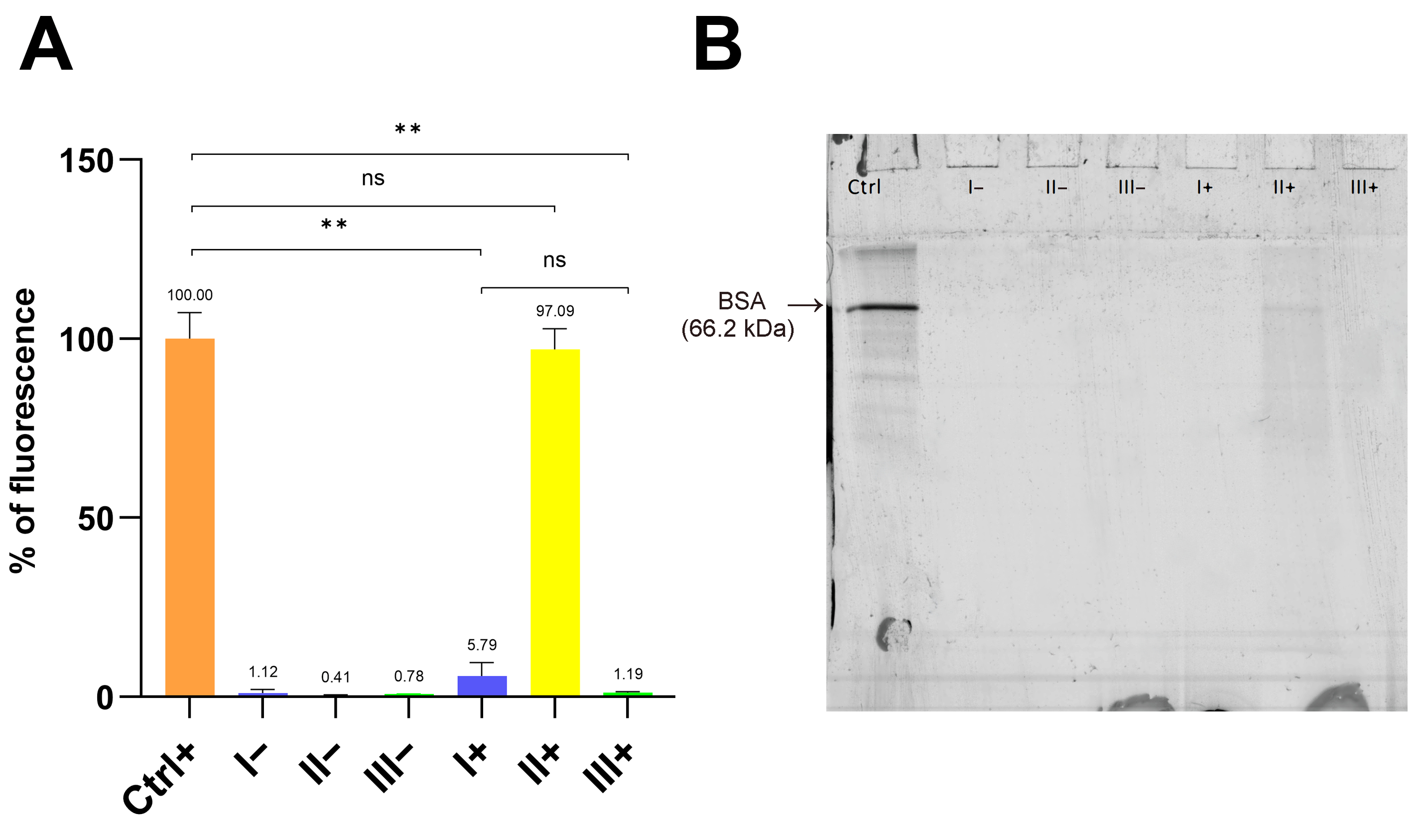 Unpaired t-tests were used to compare residual fluorescence intensities after the clean-up protocols, using GraphPad Prism 10.4.2 (GraphPad Software, Boston, MA, USA). Clean-up experiments were performed in duplicate, and data are presented as the mean ± standard deviation (SD). A p value of less than 0.05 was considered statistically significant.