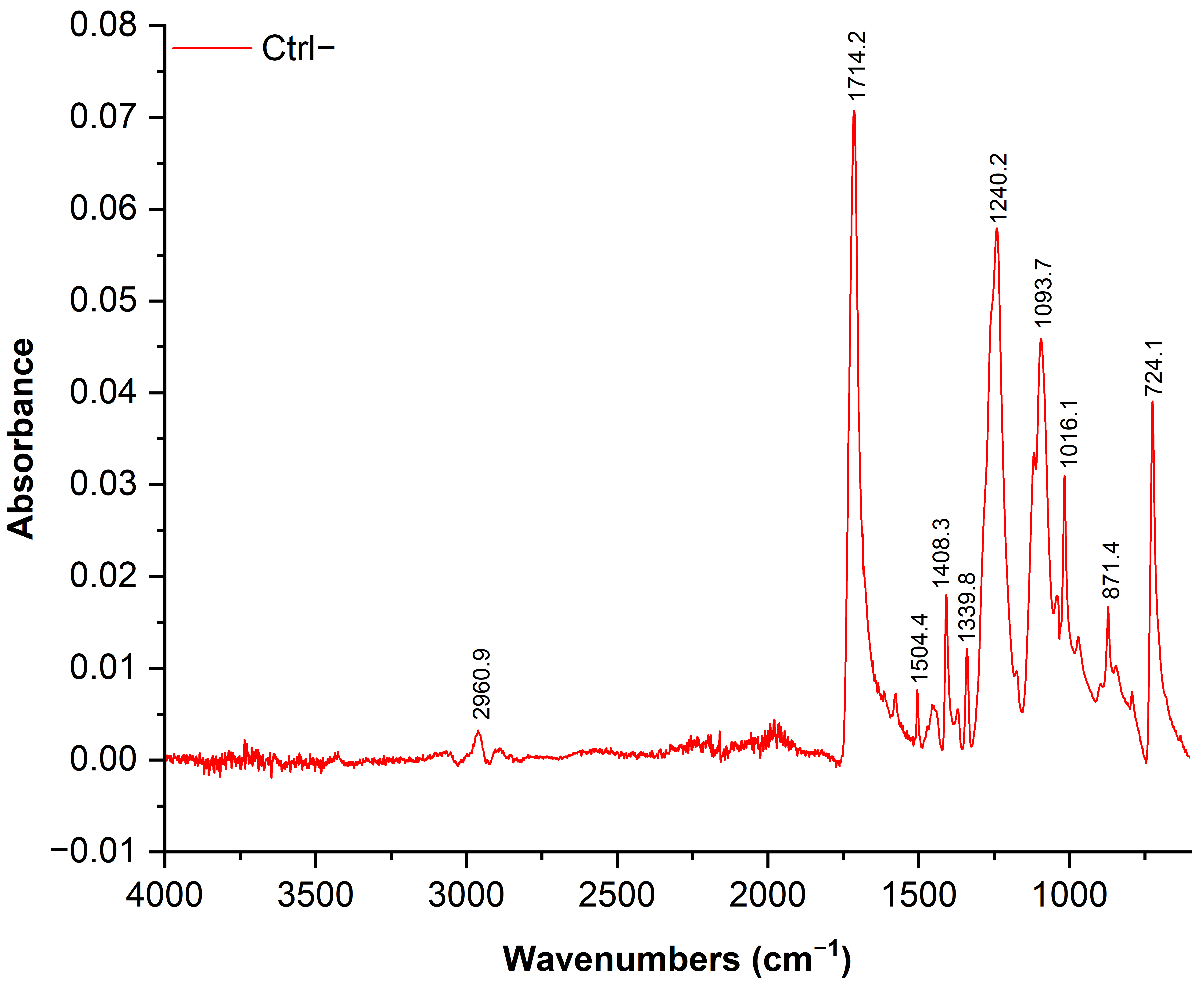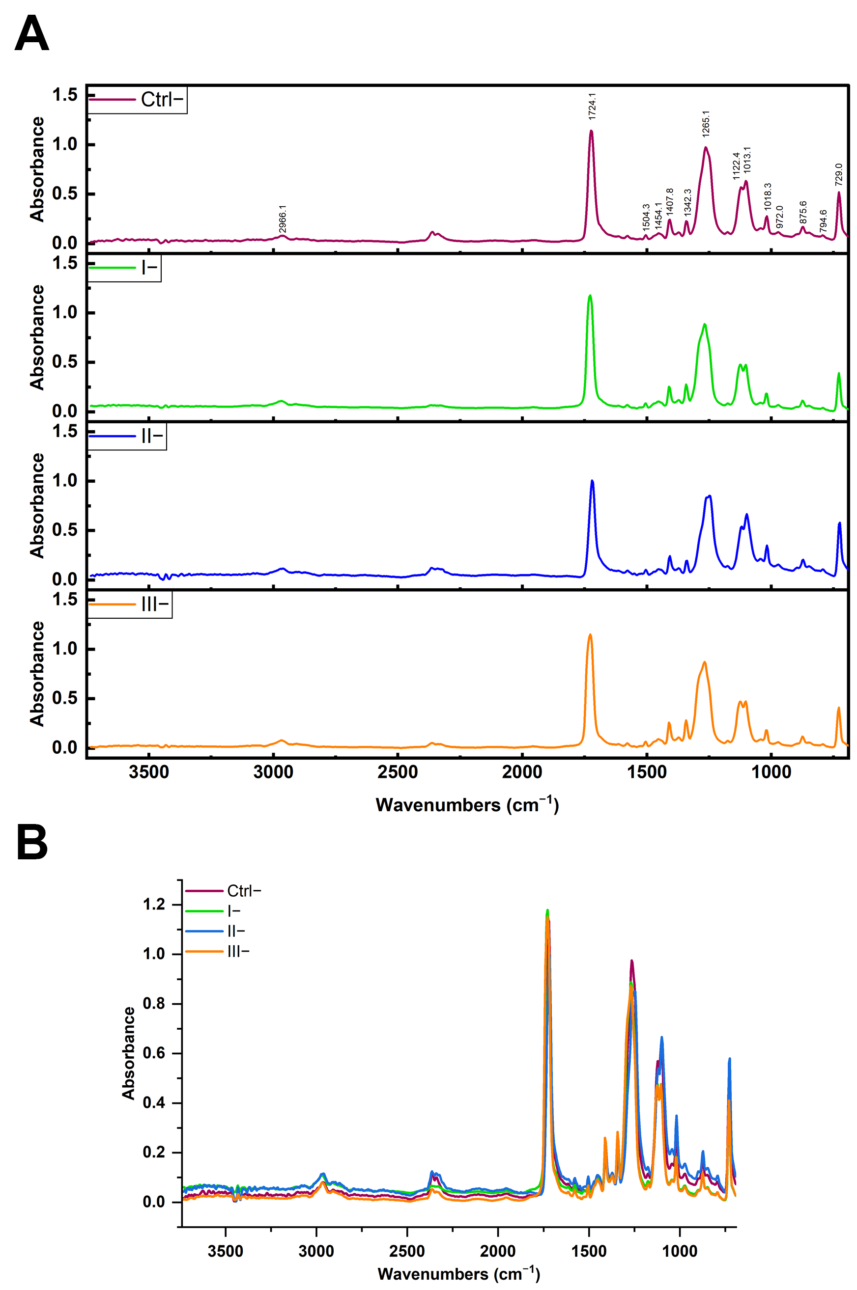 Overall, the FTIR spectral analysis reveals enzyme-specific interactions with PET MPs, with lipase exhibiting the most pronounced effects. Together with cutinase and hydrolase, lipase is one of the common enzymes associated with plastic degradation. Lipases have been produced in many bacterial and fungal strains. Lipase is one of the best biocatalysts for PET degradation. Lipase B (CALB) from the yeast