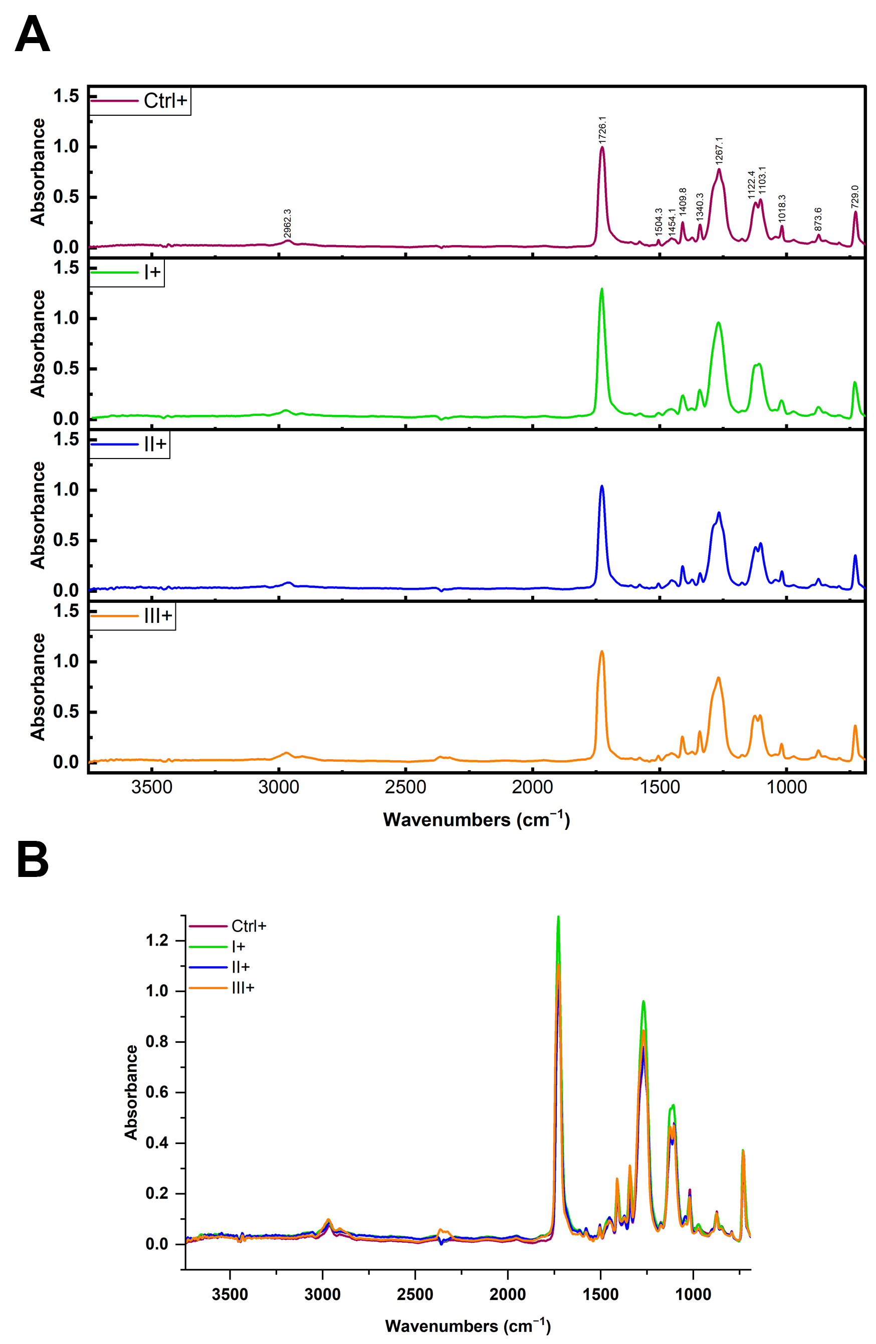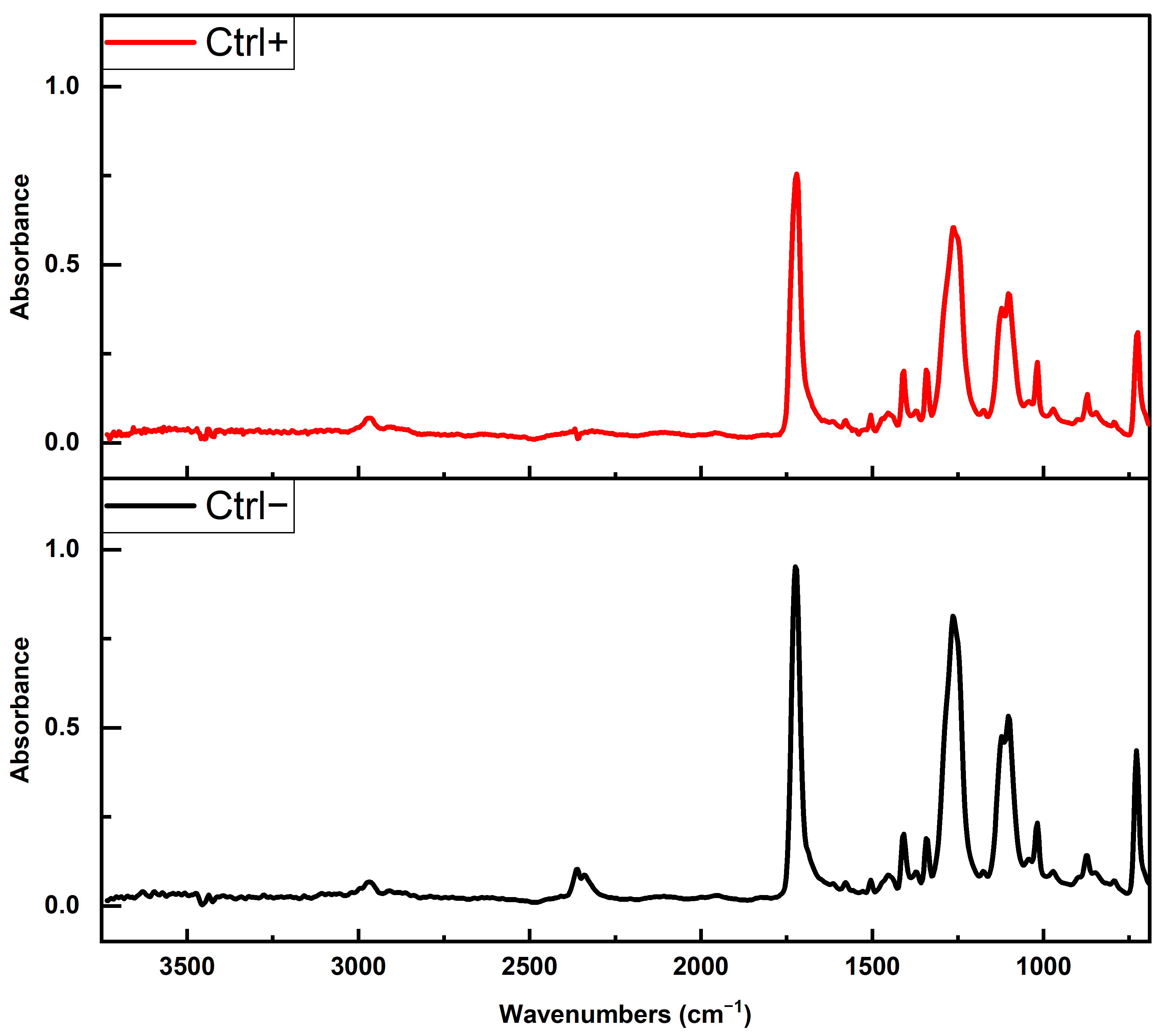 In the current study, we observed no measurable changes to PET’s key FTIR spectral markers following treatment, indicating that none of the protocols, oxidative, alkaline, or surfactant-based, compromised polymer integrity. In our spectra, all PET samples maintained these distinct peaks regardless of treatment, indicating that no significant polymer chain cleavage or oxidation occurred. This confirms that none of the clean-up protocols, including the SDS/H2O2 or H2O2/KOH combination, adversely affected the chemical structure of PET MPs.