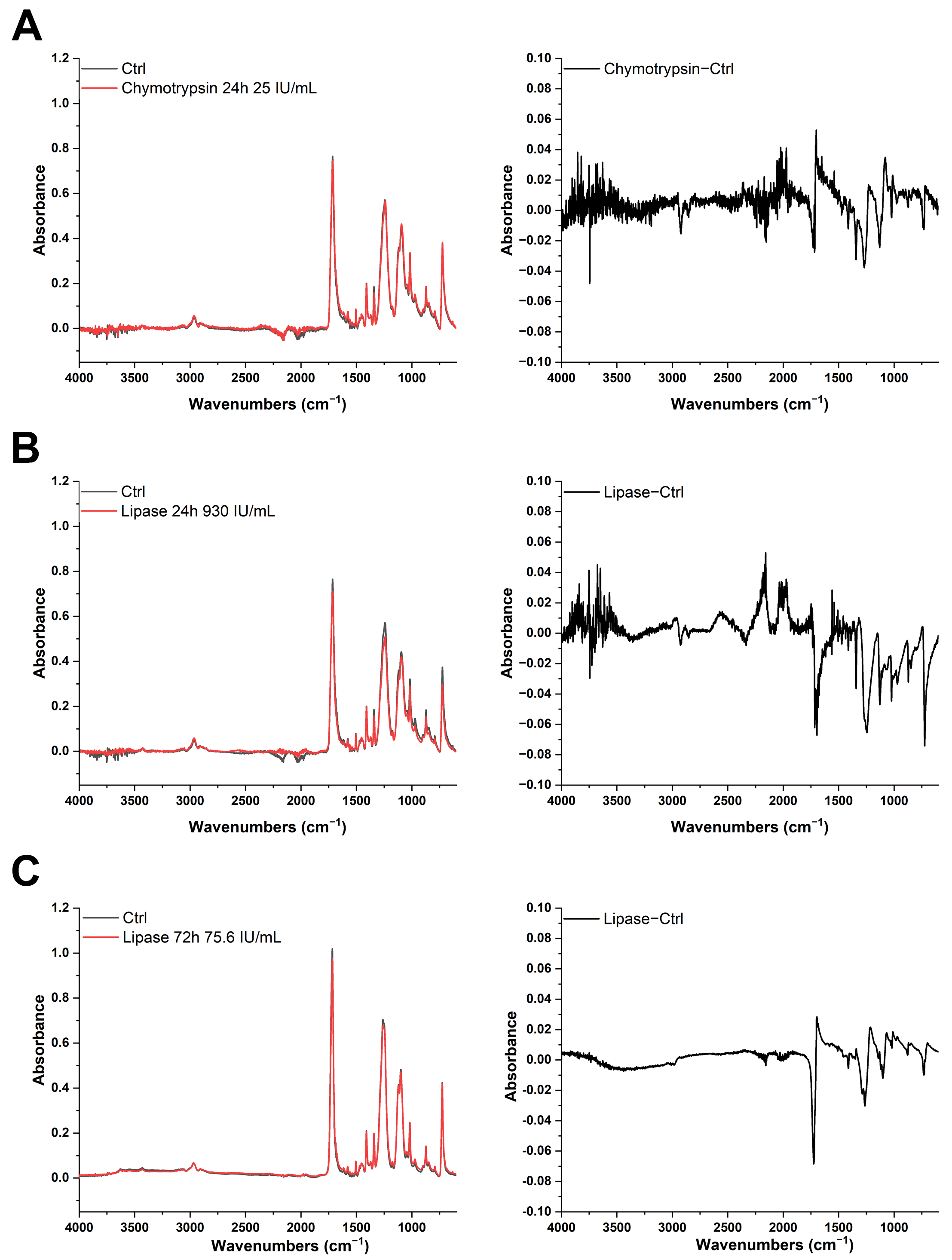 Therefore, it was particularly relevant to observe that even the partial removal of the protein corona (such as using only hydrogen peroxide) did not cause significant changes in the FTIR spectra of PET. Even though a layer of hard corona protein remained bound to the MP, it did not contribute to the signal recording by FTIR.