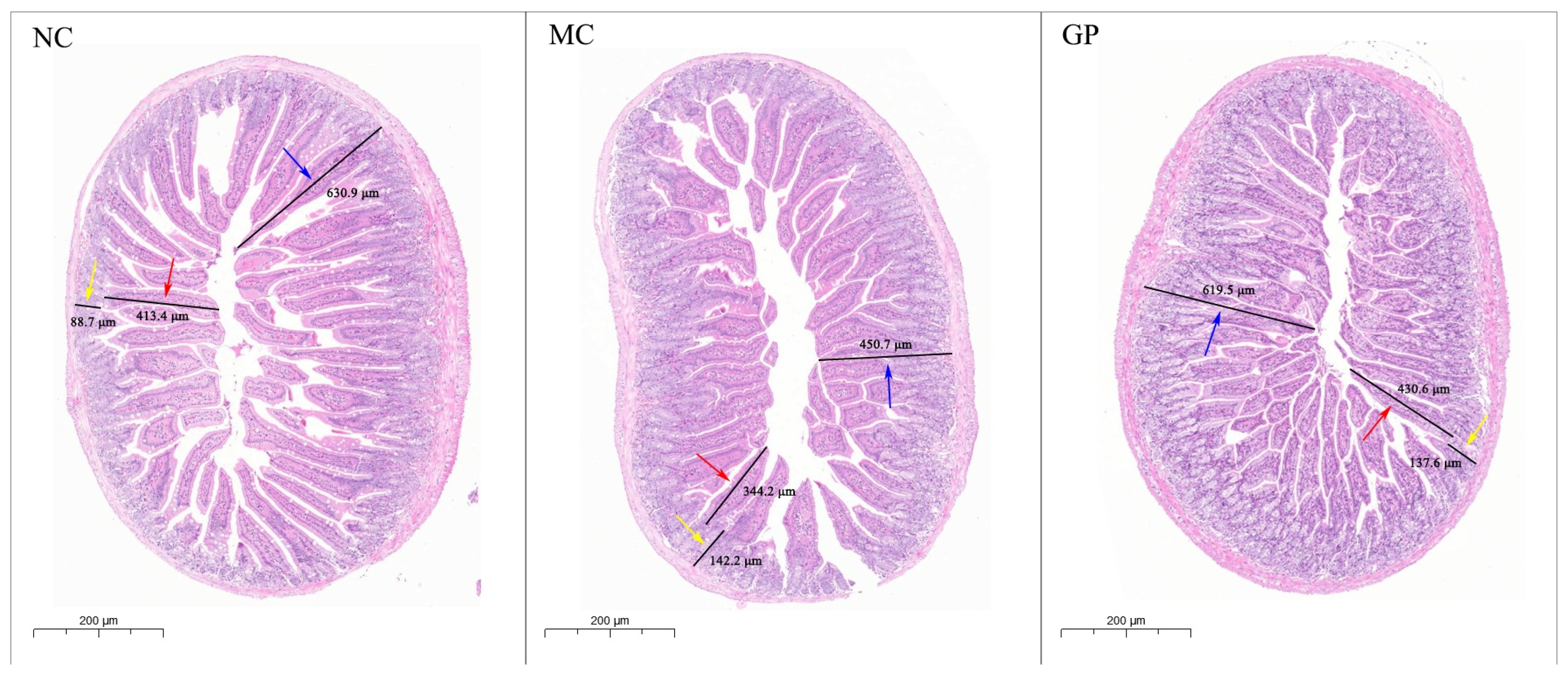 3.2. Effects of GP on the Morphological Characteristics of Intestinal Mucosa in Mice