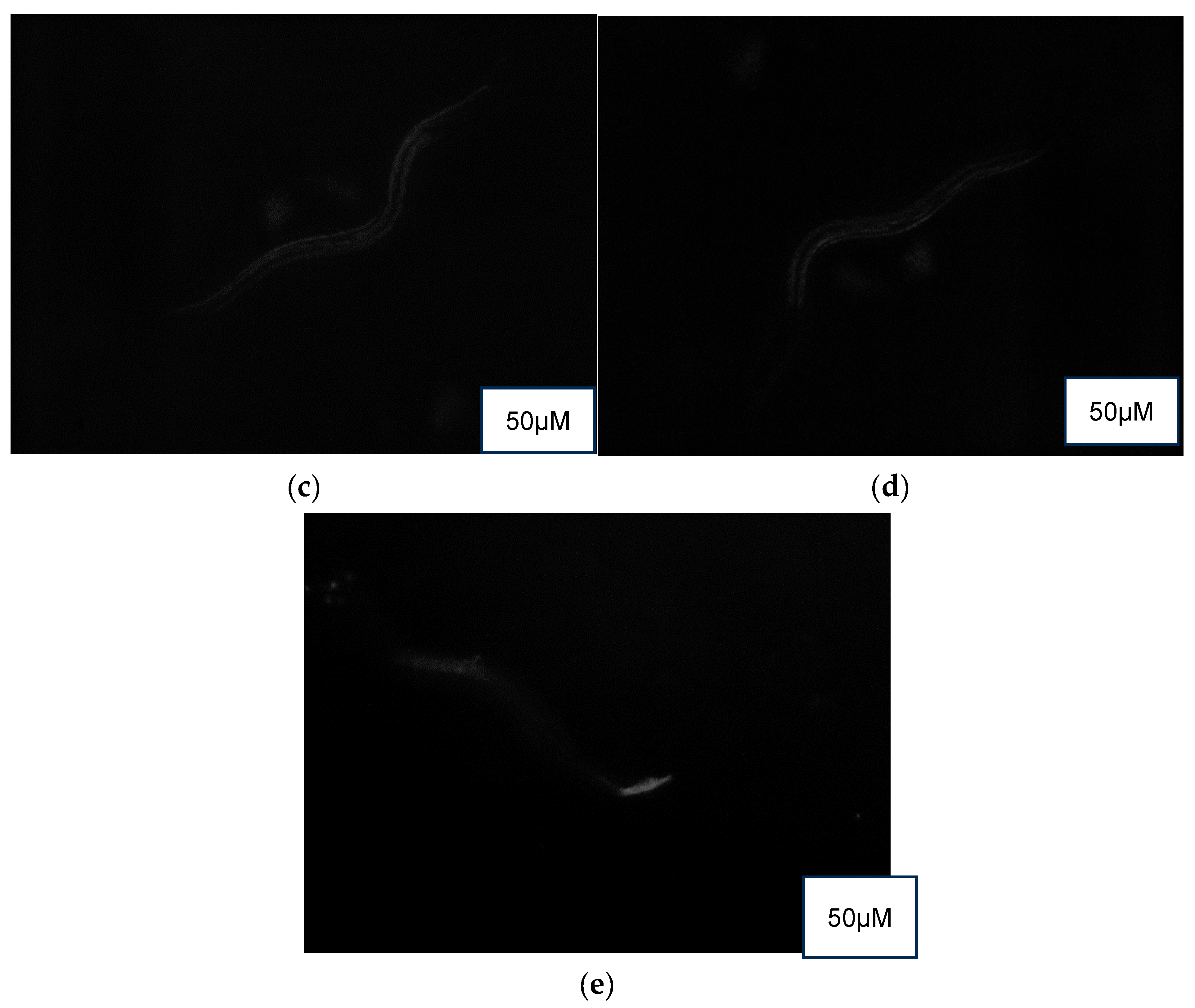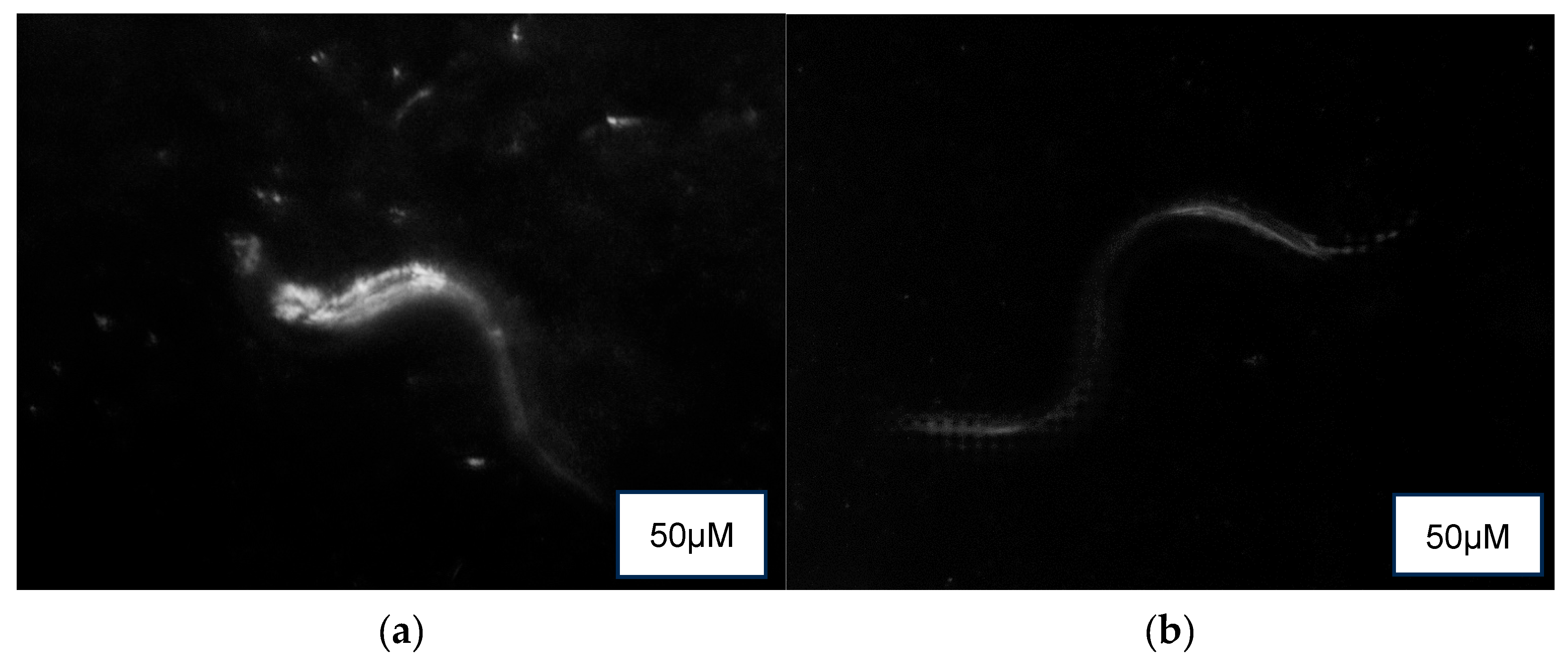 - Cho, J.; Lu, J.; Kim, D.; Park, Y. Determination of health status during aging using bending and pumping rates at various survival rates in Caenorhabditis elegans. Sci. Rep. 2025, 15, 9057. [Google Scholar] [CrossRef] [PubMed]