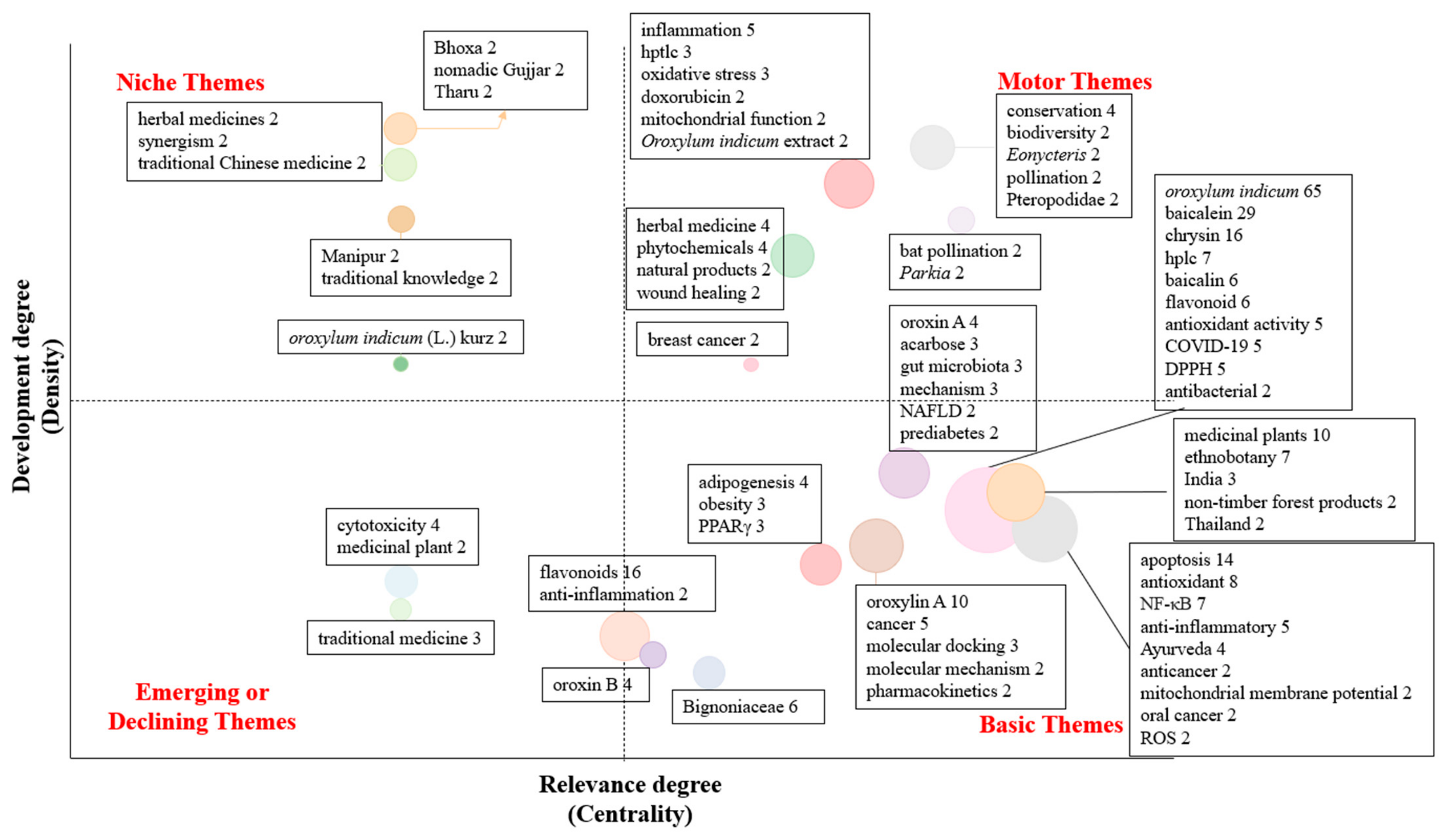 Cancer | anticancer, anti-tumor, cytotoxic, anti-metastatic, histone deacetylase (HDAC) inhibition, and anti-lymphoma. | Endophytic fungus extract, ethanol extract, ethyl acetate extract, methanol extract, aqueous extract, hydroalcoholic extract, fungal endophyte metabolites, baicalein, chrysin, oroxylin A, oroxylin A glycoside, oroxylin A-7-O-glucuronide, oroxyquinone, methoxy-chrysin, scutellarein-7-rutinoside, oroxin B, chrysin-7-O-glucuronide, oroxindin, oroxin A, and semi-synthetic derivatives. | Stem bark, bark, leaves, fruit, young stems, root, and root bark. | In vitro, in vivo, in silico. | [7,13,30,37,40,44,45,46,47,48,49,50,51,52,53,54,55,56,57,58,59,60,61,62,63] |