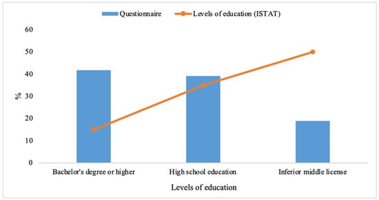 Respondents were divided into three levels of education. Specifically, 41.8% held a bachelor’s degree or higher (e.g., Ph.D., master’s degree, etc.), 39.2% of respondents had a high school education, and only 19% had an inferior middle license. The result on educational attainment is clearly in contrast (significantly higher percentage of college graduates than non-graduates) to the educational attainment estimated by ISTAT et al. [], Figure 2.