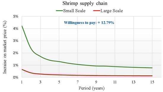 The main economic indicator considered in the investment analysis was calculated by adopting the Net Present Value (NPV) method, but with reference to the financial analysis of only the investment and management costs of the implementation of the BT, from which to derive the percentage incidence of this cost with respect to the market price of the specific supply chain product. This allows for a direct comparison between this cost increase and the percentage increase in the market price, derived from the survey, that the end consumer was WTP to have a product certified by BT. The time frame for which the investment analysis was carried out, applying the discounting method of all costs attributable to the construction of BT, was 15 years, a reasonable period as amortization time for this technology, while the discounting rate applied was considered equal to 3.56%, as established by the MISE for the year 2023 [].